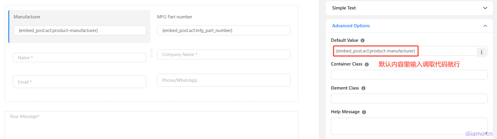 ACF字段非常常用,尤其是定制产品详情页经常用到,详情页表单有时会需要自动调取相应ACF字段内容。只要在表单的默认内容里面填入短码 {embed_post.acf.ACF_KEY} 即可调取显示相应内容。ACF_KEY 需要改成相应ACF字段的名称。